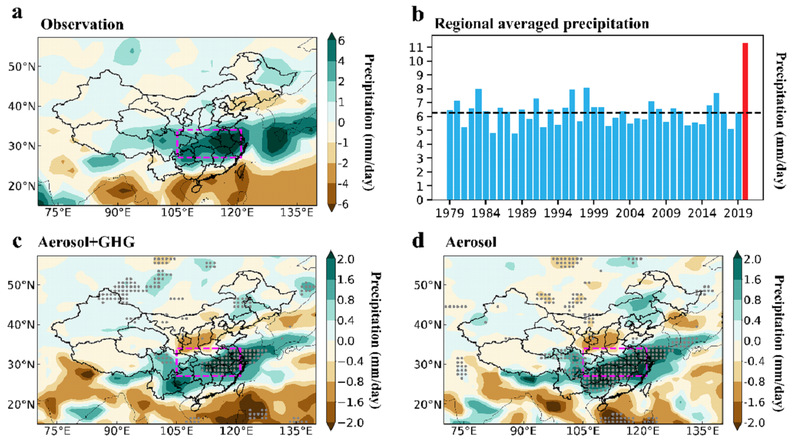 图1(a)观测得到的2020年夏季长江流域的降水异常空间分布,(b)长江流域历年夏季平均降水量,(c)气溶胶和温室气体减排共同作用以及(d)气溶胶减排单独对降水异常的贡献。