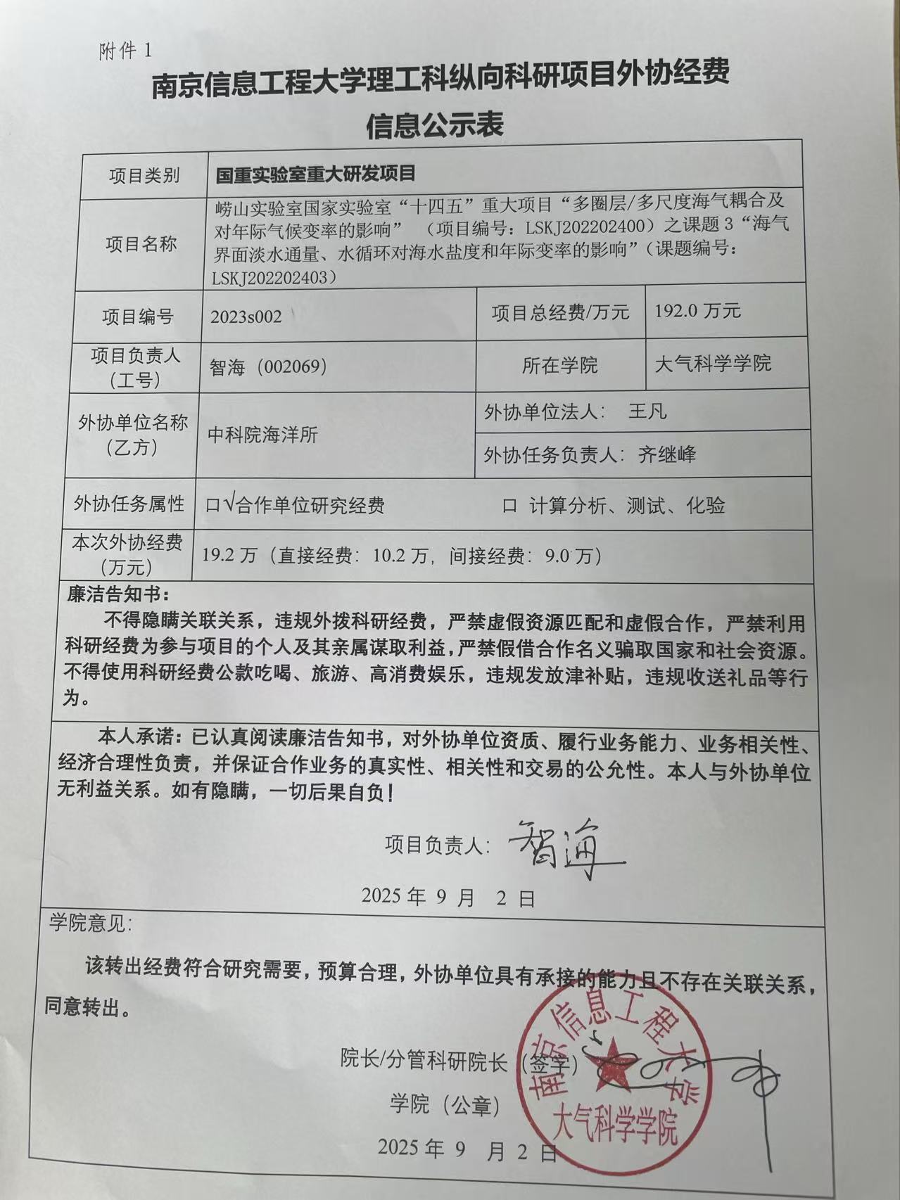根据《中共教育部党组关于抓好赋予科研管理更大自主权有关文件贯彻落实工作的通知》(教党函〔2019〕37号)、《南京信息工程大学理工科纵向科研项目经费管理办法》(校发〔2025〕81号)、《南京信息工程大学理工科纵向科研项目管理办法》(校发〔2024〕142号)相关规定,现对_大气科学学院智海负责人的_崂山实验室科技创新项目进行公示,公示时间为_2025年9月18日至2025年9月24日(公示时间不少于5个工作日)。若对本项目外协经费有异议,请于公示期内向学院或科学技术处反映并提交书面材料。反映公示对象的情况和问题要坚持实事求是的原则,以个人名义反映情况和问题要求签署或自报本人真实姓名,以单位名义反映情况的应加盖单位公章。