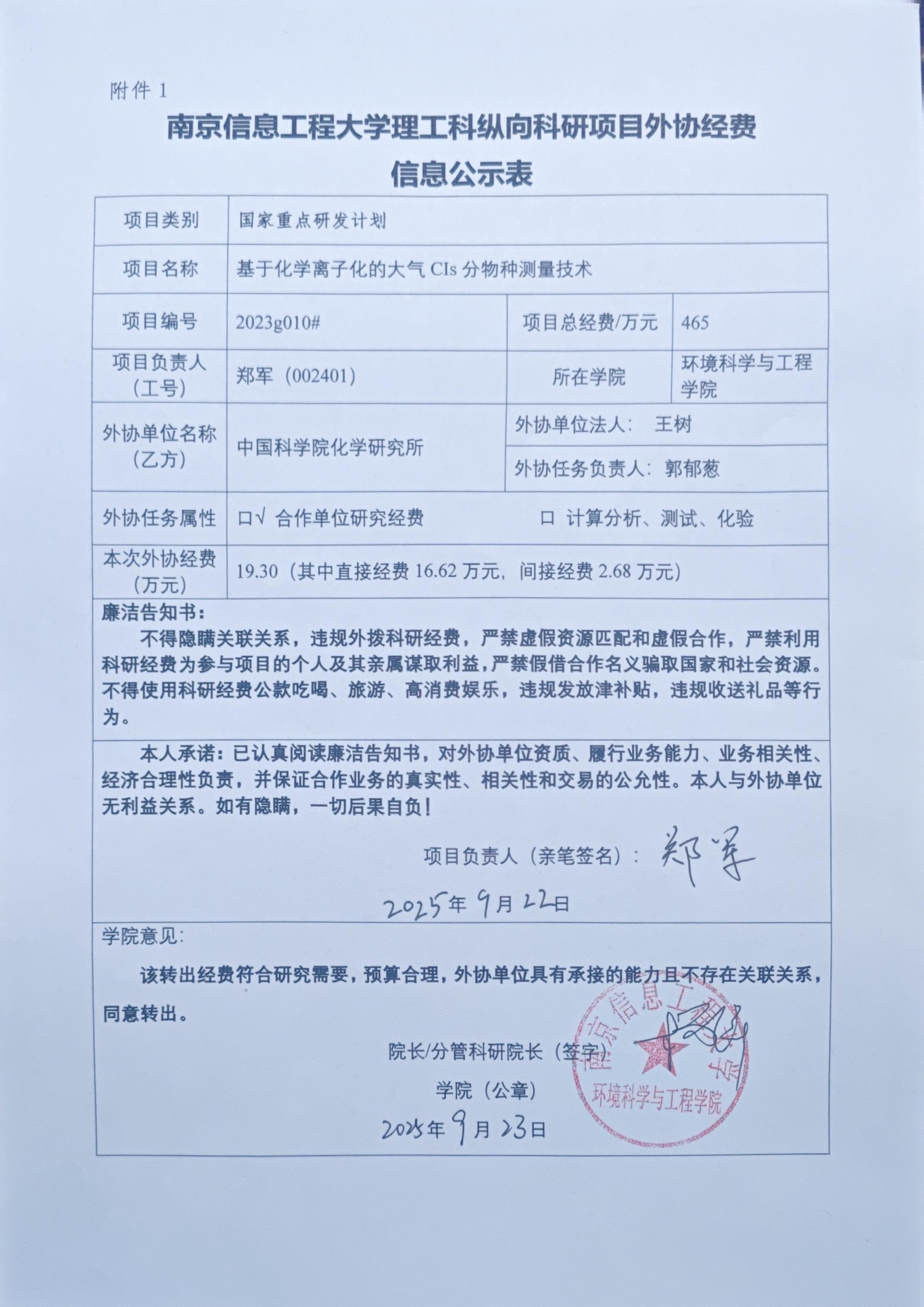 根据《中共教育部党组关于抓好赋予科研管理更大自主权有关文件贯彻落实工作的通知》(教党函〔2019〕37号)、《南京信息工程大学理工科纵向科研项目经费管理办法》(校发〔2025〕81号)、《南京信息工程大学理工科纵向科研项目管理办法》(校发〔2024〕142号)相关规定,现对_环境科学与工程学院郑军负责人的_国家重点研发计划重点专项课题合作单位进行公示,公示时间为_2025年9月23日至2025年9月28日(公示时间不少于5个工作日)。若对本项目外协经费有异议,请于公示期内向学院或科学技术处反映并提交书面材料。反映公示对象的情况和问题要坚持实事求是的原则,以个人名义反映情况和问题要求签署或自报本人真实姓名,以单位名义反映情况的应加盖单位公章。