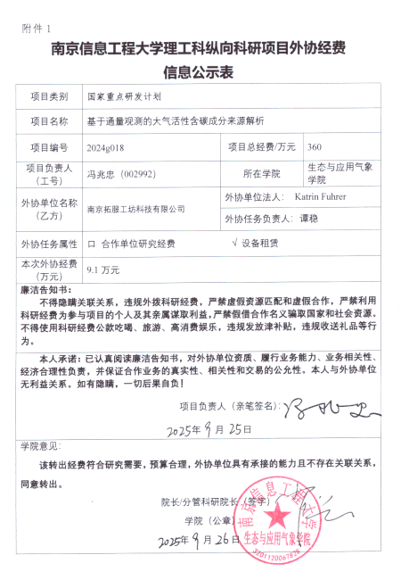 根据《中共教育部党组关于抓好赋予科研管理更大自主权有关文件贯彻落实工作的通知》(教党函〔2019〕37号)、《南京信息工程大学理工科纵向科研项目经费管理办法》(校发〔2025〕81号)、《南京信息工程大学理工科纵向科研项目管理办法》(校发〔2024〕142号)相关规定,现对_生态与应用气象学院冯兆忠负责人的_国家重点研发计划“大气与土壤、地下水污染综合治理”重点专项课题的外协经费情况进行公示,公示时间为_2025年9月26日至2025年10月9日(公示时间不少于5个工作日)。若对本项目外协经费有异议,请于公示期内向学院或科学技术处反映并提交书面材料。反映公示对象的情况和问题要坚持实事求是的原则,以个人名义反映情况和问题要求签署或自报本人真实姓名,以单位名义反映情况的应加盖单位公章。