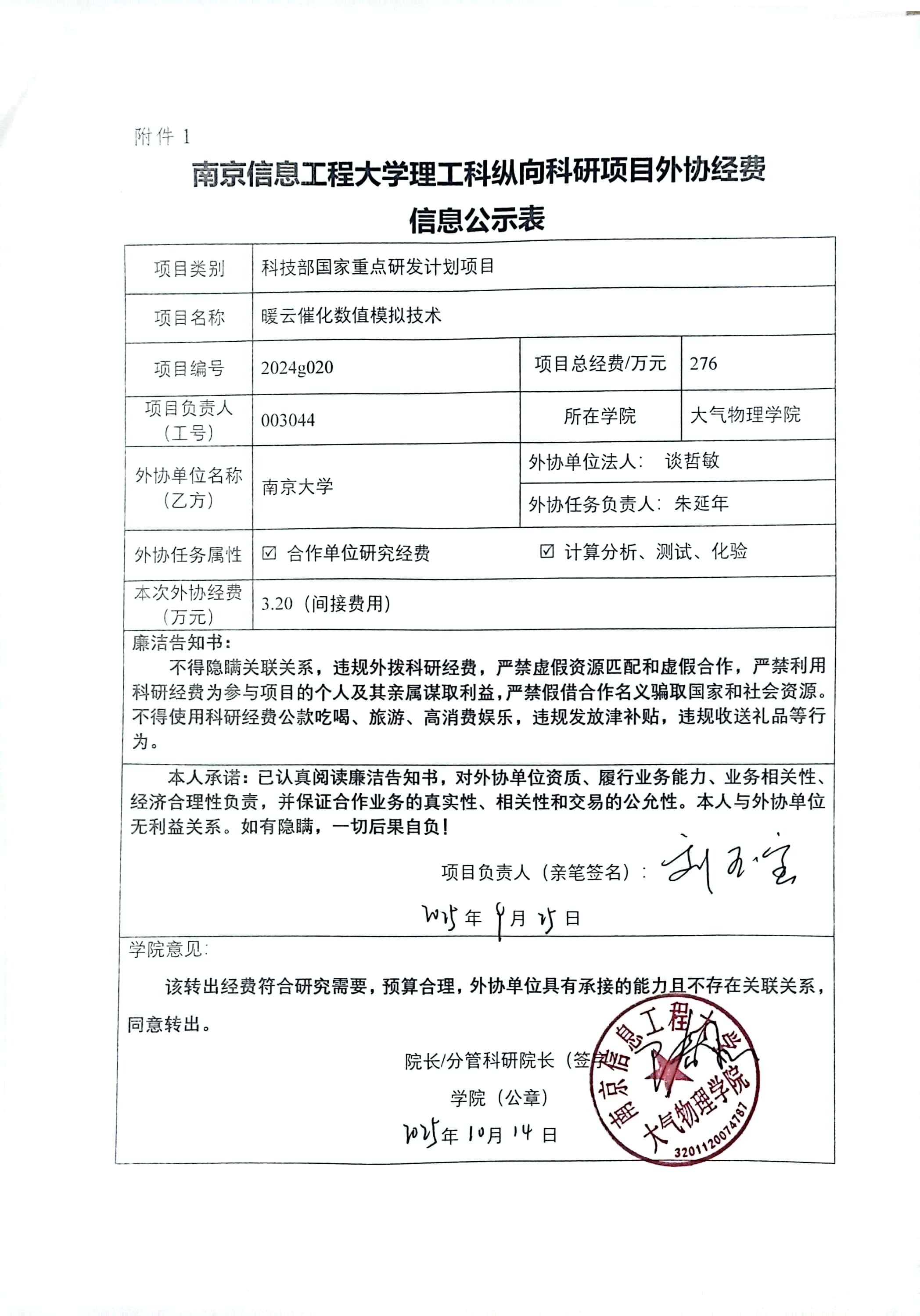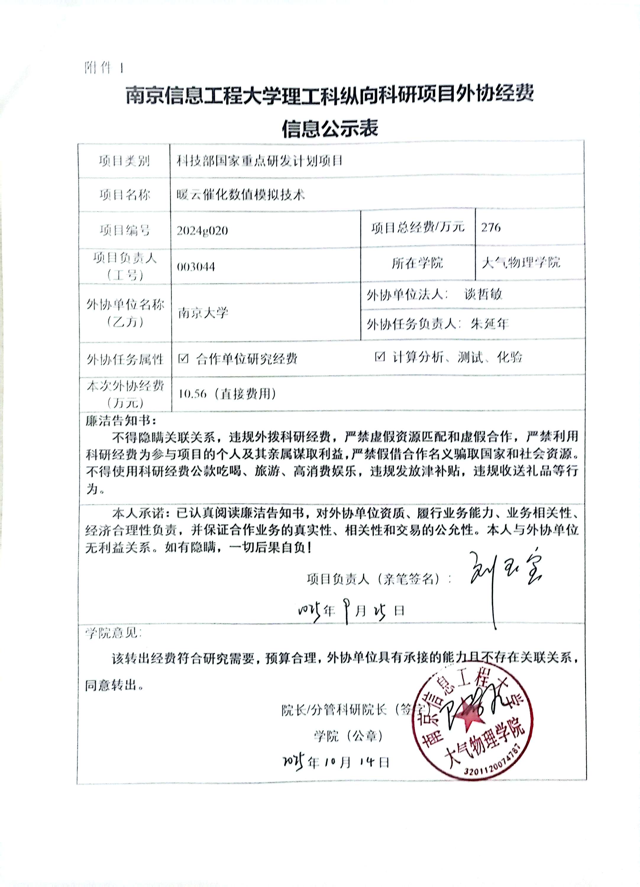 根据《中共教育部党组关于抓好赋予科研管理更大自主权有关文件贯彻落实工作的通知》(教党函〔2019〕37号)、《南京信息工程大学理工科纵向科研项目经费管理办法》(校发〔2025〕81号)、《南京信息17工程大学理工科纵向科研项目管理办法》(校发〔2024〕142号)相关规定,现对_大气物理学院刘玉宝负责人的_国家重点研发计划重点专项课题 的外协经费情况进行公示,公示时间为_2025年10月17日至2025年10月23日(公示时间不少于5个工作日)。若对本项目外协经费有异议,请于公示期内向学院或科学技术处反映并提交书面材料。反映公示对象的情况和问题要坚持实事求是的原则,以个人名义反映情况和问题要求签署或自报本人真实姓名,以单位名义反映情况的应加盖单位公章。