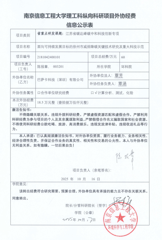 根据《中共教育部党组关于抓好赋予科研管理更大自主权有关文件贯彻落实工作的通知》(教党函〔2019〕37号)、《南京信息工程大学理工科纵向科研项目经费管理办法》(校发〔2025〕81号)、《南京信息17工程大学理工科纵向科研项目管理办法》(校发〔2024〕142号)相关规定,现对_环境科学与工程学院陈报章负责人的_江苏省碳达峰碳中和科技创新专项专题 的外协经费情况进行公示,公示时间为_2025年10月21日至2025年10月27日(公示时间不少于5个工作日)。若对本项目外协经费有异议,请于公示期内向学院或科学技术处反映并提交书面材料。反映公示对象的情况和问题要坚持实事求是的原则,以个人名义反映情况和问题要求签署或自报本人真实姓名,以单位名义反映情况的应加盖单位公章。