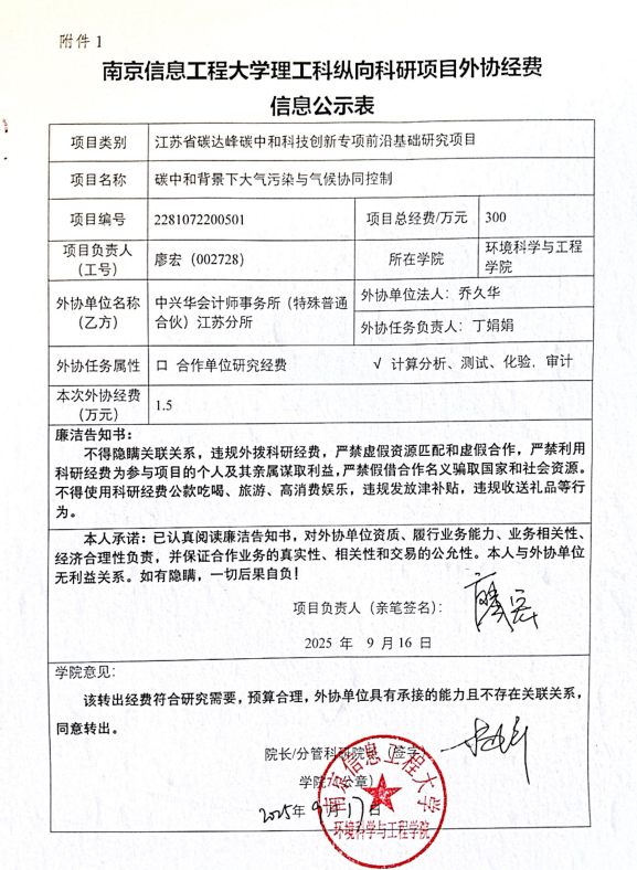 根据《中共教育部党组关于抓好赋予科研管理更大自主权有关文件贯彻落实工作的通知》(教党函〔2019〕37号)、《南京信息工程大学理工科纵向科研项目经费管理办法》(校发〔2025〕81号)、《南京信息17工程大学理工科纵向科研项目管理办法》(校发〔2024〕142号)相关规定,现对_环境科学与工程学院廖宏负责人的_江苏省碳达峰碳中和科技创新专项项目 的外协经费情况进行公示,公示时间为_2025年10月22日至2025年10月28日(公示时间不少于5个工作日)。若对本项目外协经费有异议,请于公示期内向学院或科学技术处反映并提交书面材料。反映公示对象的情况和问题要坚持实事求是的原则,以个人名义反映情况和问题要求签署或自报本人真实姓名,以单位名义反映情况的应加盖单位公章。