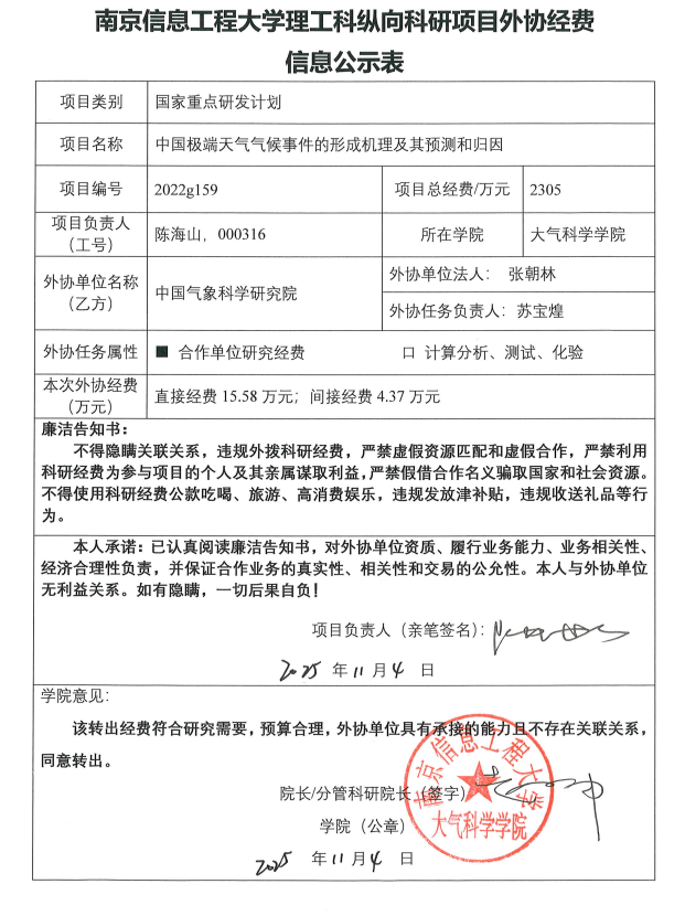 根据《中共教育部党组关于抓好赋予科研管理更大自主权有关文件贯彻落实工作的通知》(教党函〔2019〕37号)、《南京信息工程大学理工科纵向科研项目经费管理办法》(校发〔2025〕81号)、《南京信息17工程大学理工科纵向科研项目管理办法》(校发〔2024〕142号)相关规定,现对_大气科学学院陈海山负责人的_国家重点研发计划重点专项项目 的外协经费情况进行公示,公示时间为_2025年11月4日至2025年11月10日(公示时间不少于5个工作日)。若对本项目外协经费有异议,请于公示期内向学院或科学技术处反映并提交书面材料。反映公示对象的情况和问题要坚持实事求是的原则,以个人名义反映情况和问题要求签署或自报本人真实姓名,以单位名义反映情况的应加盖单位公章。
