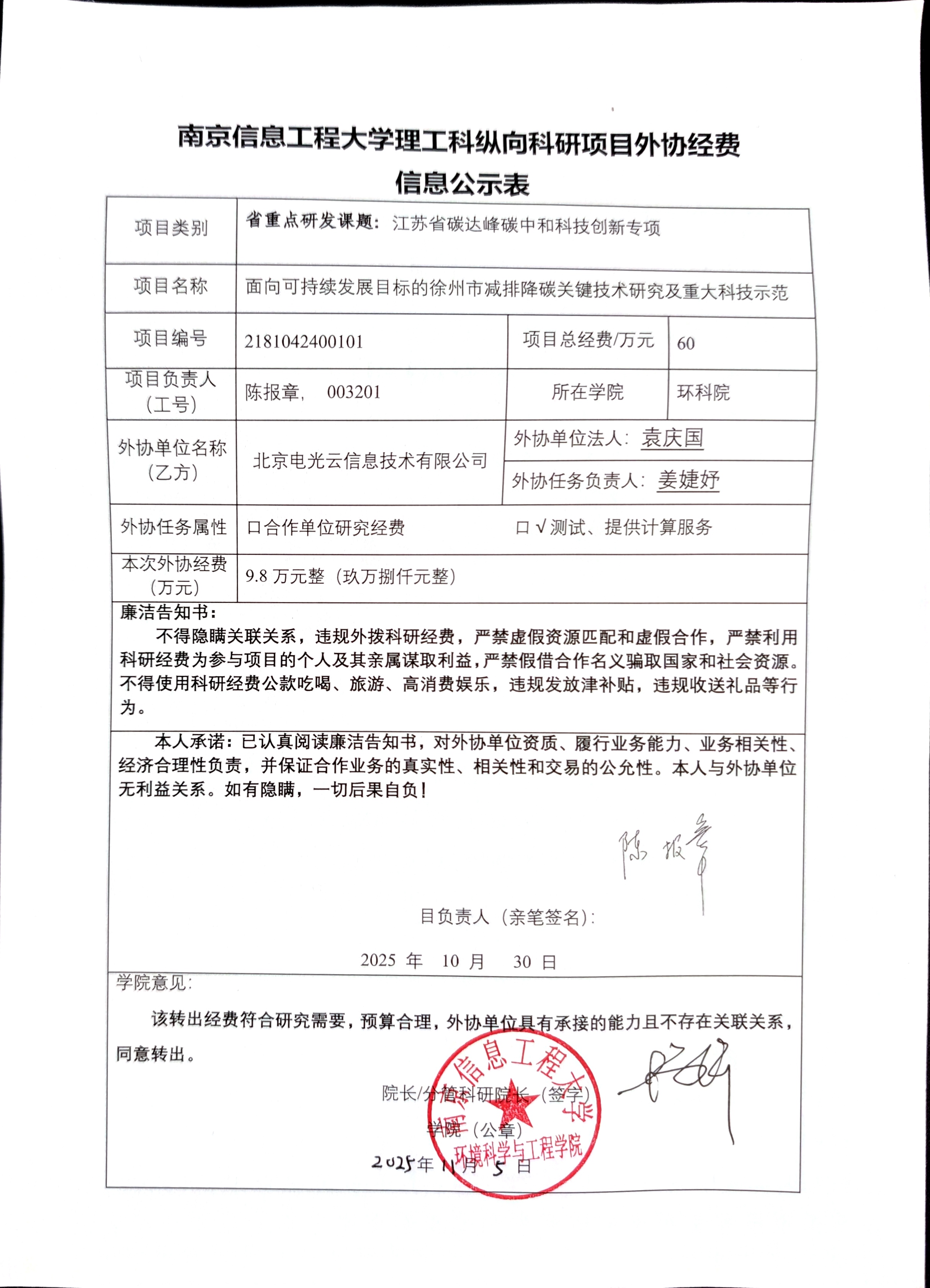 根据《中共教育部党组关于抓好赋予科研管理更大自主权有关文件贯彻落实工作的通知》(教党函〔2019〕37号)、《南京信息工程大学理工科纵向科研项目经费管理办法》(校发〔2025〕81号)、《南京信息17工程大学理工科纵向科研项目管理办法》(校发〔2024〕142号)相关规定,现对_环境科学与工程学院陈报章负责人的_江苏省碳达峰碳中和科技创新专项资金专题 的外协经费情况进行公示,公示时间为_2025年11月6日至2025年11月12日(公示时间不少于5个工作日)。若对本项目外协经费有异议,请于公示期内向学院或科学技术处反映并提交书面材料。反映公示对象的情况和问题要坚持实事求是的原则,以个人名义反映情况和问题要求签署或自报本人真实姓名,以单位名义反映情况的应加盖单位公章。