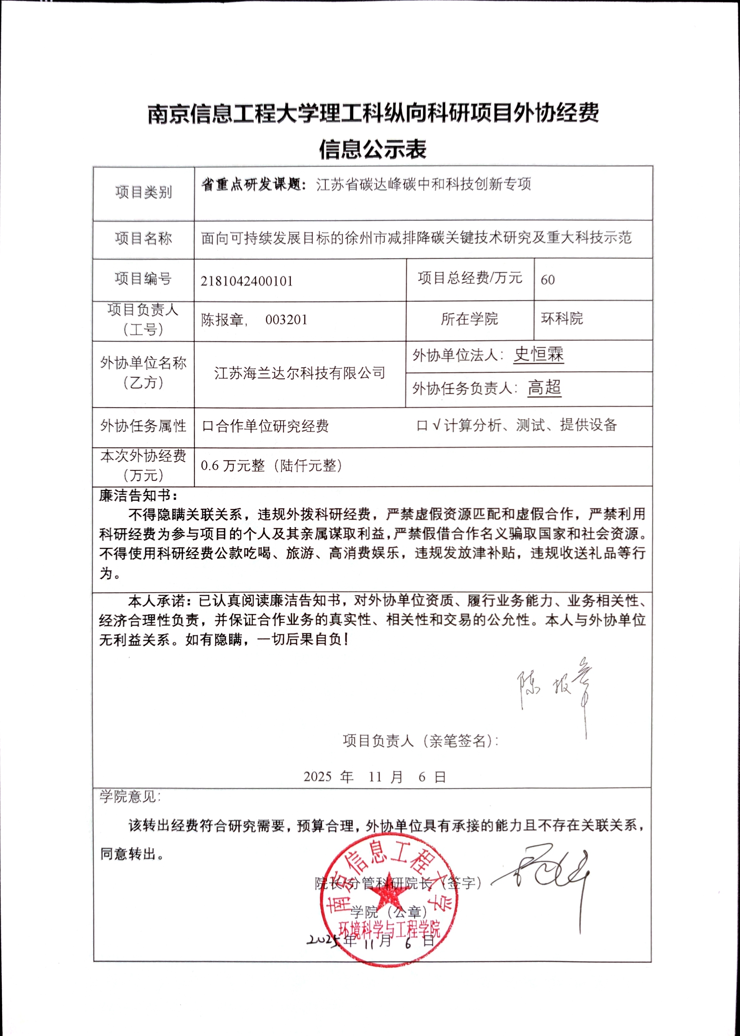 根据《中共教育部党组关于抓好赋予科研管理更大自主权有关文件贯彻落实工作的通知》(教党函〔2019〕37号)、《南京信息工程大学理工科纵向科研项目经费管理办法》(校发〔2025〕81号)、《南京信息17工程大学理工科纵向科研项目管理办法》(校发〔2024〕142号)相关规定,现对_环境科学与工程学院陈报章负责人的_江苏省碳达峰碳中和科技创新专项资金专题 的外协经费情况进行公示,公示时间为_2025年11月6日至2025年11月12日(公示时间不少于5个工作日)。若对本项目外协经费有异议,请于公示期内向学院或科学技术处反映并提交书面材料。反映公示对象的情况和问题要坚持实事求是的原则,以个人名义反映情况和问题要求签署或自报本人真实姓名,以单位名义反映情况的应加盖单位公章。