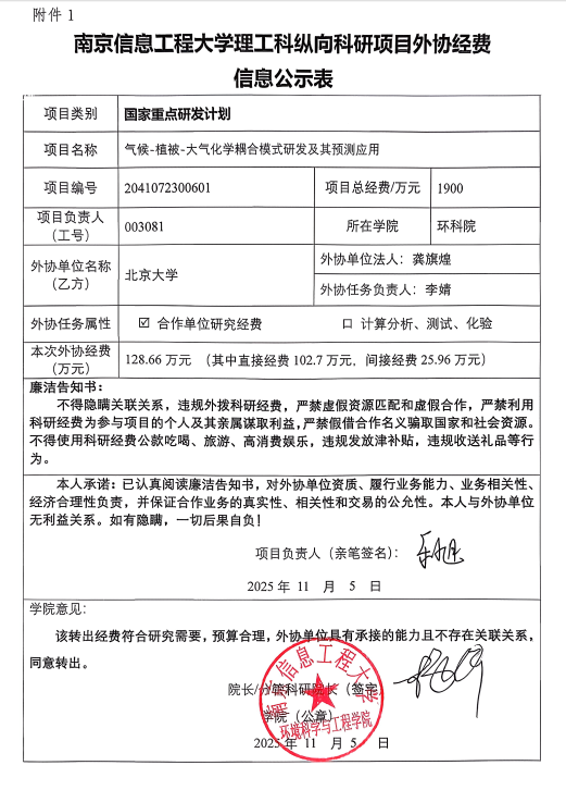 根据《中共教育部党组关于抓好赋予科研管理更大自主权有关文件贯彻落实工作的通知》(教党函〔2019〕37号)、《南京信息工程大学理工科纵向科研项目经费管理办法》(校发〔2025〕81号)、《南京信息17工程大学理工科纵向科研项目管理办法》(校发〔2024〕142号)相关规定,现对_环境科学与工程学院乐旭负责人的_国家重点研发计划重点专项项目 的外协经费情况进行公示,公示时间为_2025年11月7日至2025年11月13日(公示时间不少于5个工作日)。若对本项目外协经费有异议,请于公示期内向学院或科学技术处反映并提交书面材料。反映公示对象的情况和问题要坚持实事求是的原则,以个人名义反映情况和问题要求签署或自报本人真实姓名,以单位名义反映情况的应加盖单位公章。