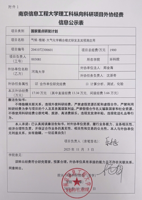 根据《中共教育部党组关于抓好赋予科研管理更大自主权有关文件贯彻落实工作的通知》(教党函〔2019〕37号)、《南京信息工程大学理工科纵向科研项目经费管理办法》(校发〔2025〕81号)、《南京信息17工程大学理工科纵向科研项目管理办法》(校发〔2024〕142号)相关规定,现对_环境科学与工程学院乐旭负责人的_国家重点研发计划重点专项项目 的外协经费情况进行公示,公示时间为_2025年11月7日至2025年11月13日(公示时间不少于5个工作日)。若对本项目外协经费有异议,请于公示期内向学院或科学技术处反映并提交书面材料。反映公示对象的情况和问题要坚持实事求是的原则,以个人名义反映情况和问题要求签署或自报本人真实姓名,以单位名义反映情况的应加盖单位公章。