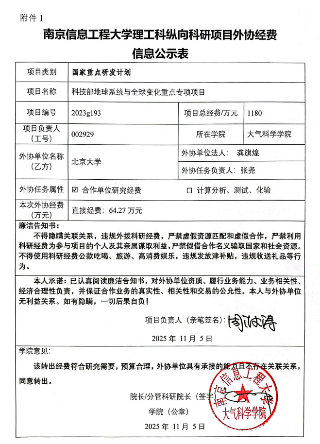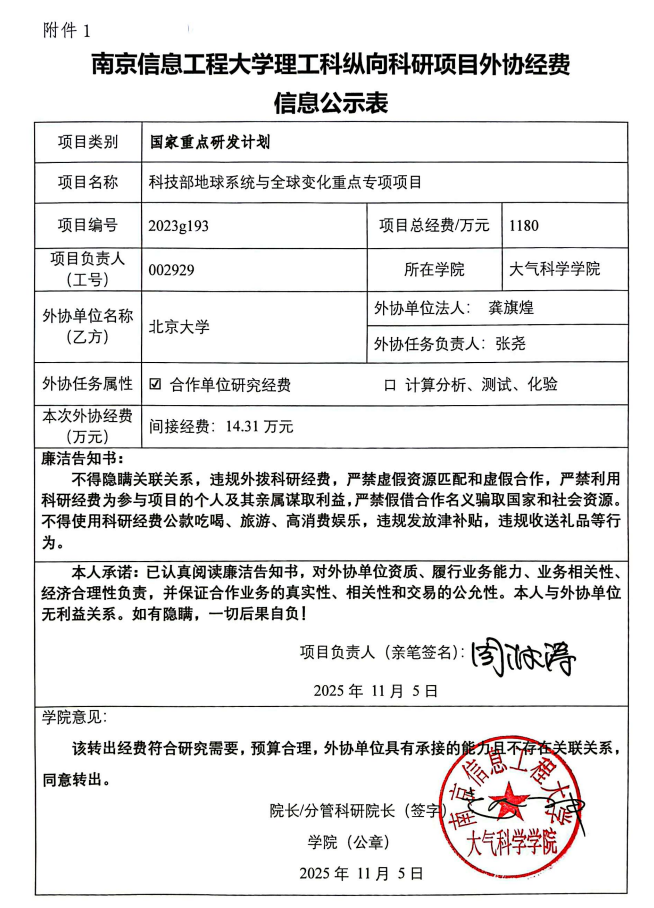 根据《中共教育部党组关于抓好赋予科研管理更大自主权有关文件贯彻落实工作的通知》(教党函〔2019〕37号)、《南京信息工程大学理工科纵向科研项目经费管理办法》(校发〔2025〕81号)、《南京信息17工程大学理工科纵向科研项目管理办法》(校发〔2024〕142号)相关规定,现对_大气科学学院周波涛负责人的_国家重点研发计划重点专项项目 的外协经费情况进行公示,公示时间为_2025年11月7日至2025年11月13日(公示时间不少于5个工作日)。若对本项目外协经费有异议,请于公示期内向学院或科学技术处反映并提交书面材料。反映公示对象的情况和问题要坚持实事求是的原则,以个人名义反映情况和问题要求签署或自报本人真实姓名,以单位名义反映情况的应加盖单位公章。
