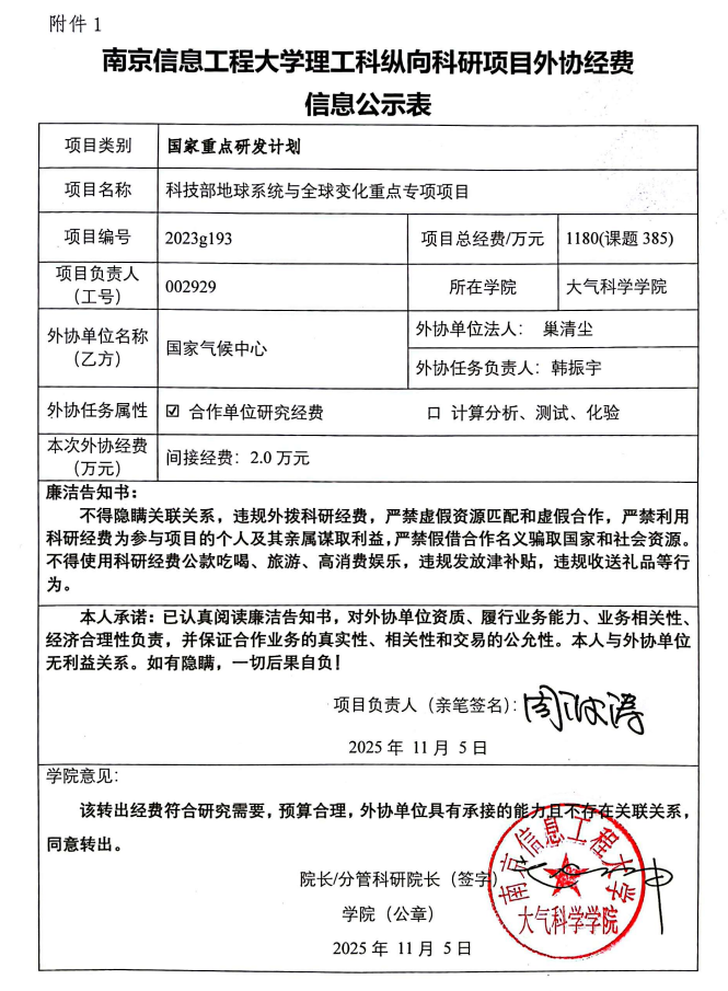 根据《中共教育部党组关于抓好赋予科研管理更大自主权有关文件贯彻落实工作的通知》(教党函〔2019〕37号)、《南京信息工程大学理工科纵向科研项目经费管理办法》(校发〔2025〕81号)、《南京信息17工程大学理工科纵向科研项目管理办法》(校发〔2024〕142号)相关规定,现对_大气科学学院周波涛负责人的_国家重点研发计划重点专项项目 的外协经费情况进行公示,公示时间为_2025年11月7日至2025年11月13日(公示时间不少于5个工作日)。若对本项目外协经费有异议,请于公示期内向学院或科学技术处反映并提交书面材料。反映公示对象的情况和问题要坚持实事求是的原则,以个人名义反映情况和问题要求签署或自报本人真实姓名,以单位名义反映情况的应加盖单位公章。