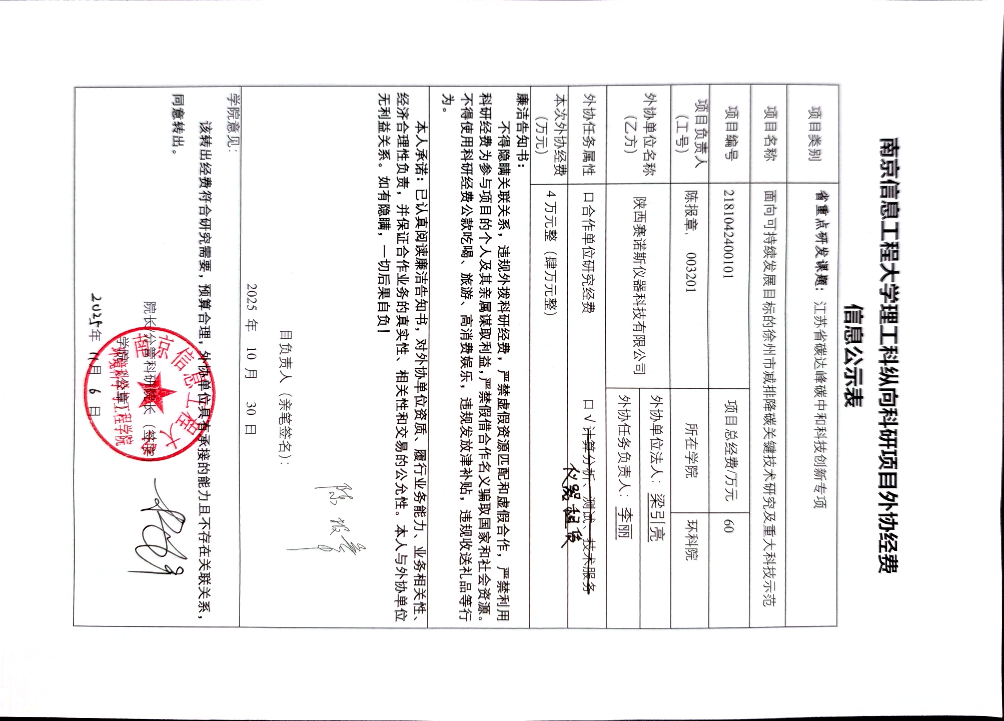 根据《中共教育部党组关于抓好赋予科研管理更大自主权有关文件贯彻落实工作的通知》(教党函〔2019〕37号)、《南京信息工程大学理工科纵向科研项目经费管理办法》(校发〔2025〕81号)、《南京信息17工程大学理工科纵向科研项目管理办法》(校发〔2024〕142号)相关规定,现对_环境科学与工程学院陈报章负责人的_江苏省碳达峰碳中和科技创新专项资金专题 的外协经费情况进行公示,公示时间为_2025年11月11日至2025年11月17日(公示时间不少于5个工作日)。若对本项目外协经费有异议,请于公示期内向学院或科学技术处反映并提交书面材料。反映公示对象的情况和问题要坚持实事求是的原则,以个人名义反映情况和问题要求签署或自报本人真实姓名,以单位名义反映情况的应加盖单位公章。