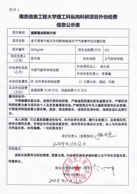 根据《中共教育部党组关于抓好赋予科研管理更大自主权有关文件贯彻落实工作的通知》(教党函〔2019〕37号)、《南京信息工程大学理工科纵向科研项目经费管理办法》(校发〔2025〕81号)、《南京信息17工程大学理工科纵向科研项目管理办法》(校发〔2024〕142号)相关规定,现对_大气科学学院张文君负责人的_国家重点研发计划重点专项课题 的外协经费情况进行公示,公示时间为_2025年11月17日至2025年11月21日(公示时间不少于5个工作日)。若对本项目外协经费有异议,请于公示期内向学院或科学技术处反映并提交书面材料。反映公示对象的情况和问题要坚持实事求是的原则,以个人名义反映情况和问题要求签署或自报本人真实姓名,以单位名义反映情况的应加盖单位公章。
