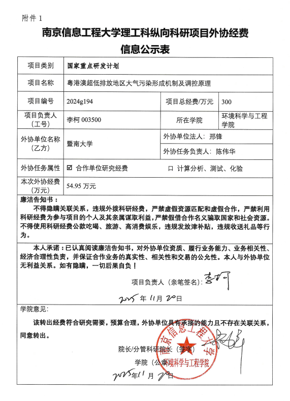 根据《中共教育部党组关于抓好赋予科研管理更大自主权有关文件贯彻落实工作的通知》(教党函〔2019〕37号)、《南京信息工程大学理工科纵向科研项目经费管理办法》(校发〔2025〕81号)、《南京信息17工程大学理工科纵向科研项目管理办法》(校发〔2024〕142号)相关规定,现对_环境科学与工程学院李柯负责人的_国家重点研发计划重点专项项目 的外协经费情况进行公示,公示时间为_2025年11月20日至2025年11月26日(公示时间不少于5个工作日)。若对本项目外协经费有异议,请于公示期内向学院或科学技术处反映并提交书面材料。反映公示对象的情况和问题要坚持实事求是的原则,以个人名义反映情况和问题要求签署或自报本人真实姓名,以单位名义反映情况的应加盖单位公章。