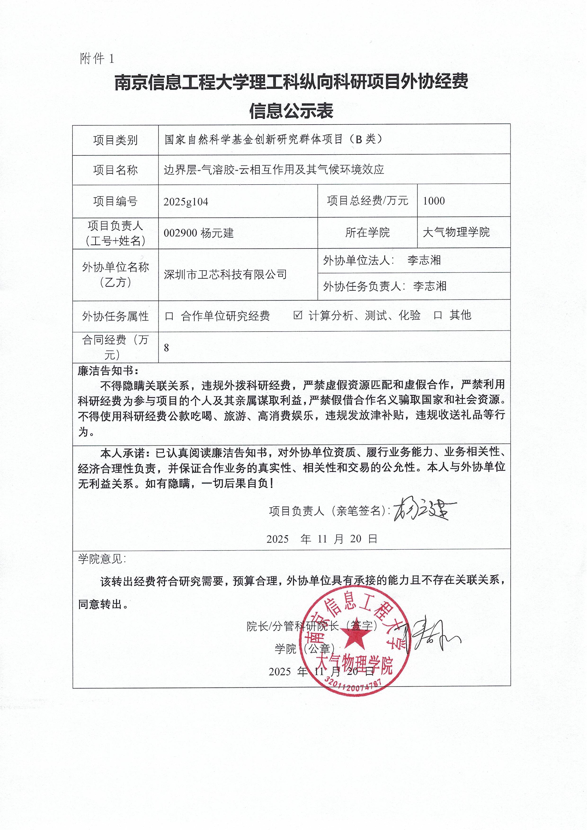根据《中共教育部党组关于抓好赋予科研管理更大自主权有关文件贯彻落实工作的通知》(教党函〔2019〕37号)、《南京信息工程大学理工科纵向科研经费管理办法》(校发〔2019〕21号)、《南京信息工程大学理工科纵向科研项目管理办法》(校发〔2024〕142号)相关规定,现对大气物理学院 杨元建项目负责人承担的_国家自然科学基金创新研究群体项目(B类)的外协经费情况进行公示,公示时间为_2025年11月24日至2025年11月28日_(公示时间不少于5个工作日)。若对本项目外协经费有异议,请于公示期内向学院或科学技术处反映并提交书面材料。反映公示对象的情况和问题要坚持实事求是的原则,以个人名义反映情况和问题要求签署或自报本人真实姓名,以单位名义反映情况的应加盖单位公章。