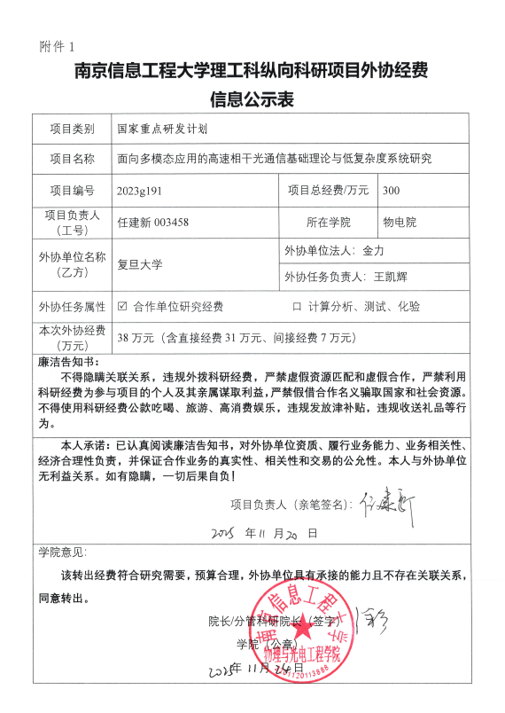 根据《中共教育部党组关于抓好赋予科研管理更大自主权有关文件贯彻落实工作的通知》(教党函〔2019〕37号)、《南京信息工程大学理工科纵向科研项目经费管理办法》(校发〔2025〕81号)、《南京信息17工程大学理工科纵向科研项目管理办法》(校发〔2024〕142号)相关规定,现对_物理与光电工程学院任建新负责人的_国家重点研发计划重点专项项目 的外协经费情况进行公示,公示时间为_2025年11月24日至2025年11月28日(公示时间不少于5个工作日)。若对本项目外协经费有异议,请于公示期内向学院或科学技术处反映并提交书面材料。反映公示对象的情况和问题要坚持实事求是的原则,以个人名义反映情况和问题要求签署或自报本人真实姓名,以单位名义反映情况的应加盖单位公章。