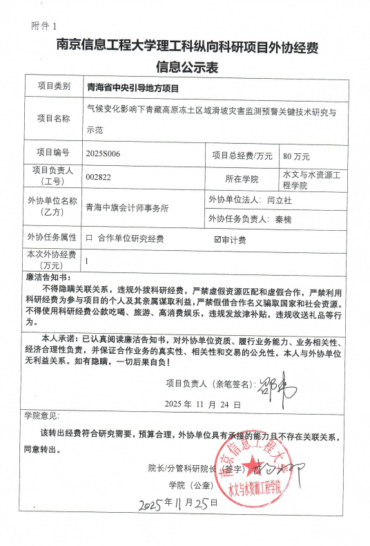 根据《中共教育部党组关于抓好赋予科研管理更大自主权有关文件贯彻落实工作的通知》(教党函〔2019〕37号)、《南京信息工程大学理工科纵向科研项目经费管理办法》(校发〔2025〕81号)、《南京信息17工程大学理工科纵向科研项目管理办法》(校发〔2024〕142号)相关规定,现对_水文与水资源工程学院邵伟负责人的_青海省中央引导地方科技发展资金项目 的外协经费情况进行公示,公示时间为_2025年11月26日至2025年12月2日(公示时间不少于5个工作日)。若对本项目外协经费有异议,请于公示期内向学院或科学技术处反映并提交书面材料。反映公示对象的情况和问题要坚持实事求是的原则,以个人名义反映情况和问题要求签署或自报本人真实姓名,以单位名义反映情况的应加盖单位公章。