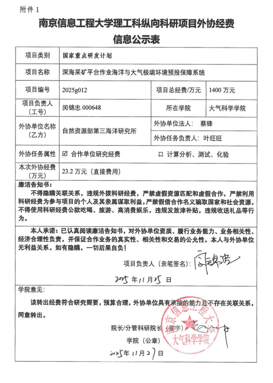 根据《中共教育部党组关于抓好赋予科研管理更大自主权有关文件贯彻落实工作的通知》(教党函〔2019〕37号)、《南京信息工程大学理工科纵向科研项目经费管理办法》(校发〔2025〕81号)、《南京信息17工程大学理工科纵向科研项目管理办法》(校发〔2024〕142号)相关规定,现对_大气科学学院闵锦忠负责人的_国家重点研发计划重点专项项目 的外协经费情况进行公示,公示时间为_2025年11月28日至2025年12月4日(公示时间不少于5个工作日)。若对本项目外协经费有异议,请于公示期内向学院或科学技术处反映并提交书面材料。反映公示对象的情况和问题要坚持实事求是的原则,以个人名义反映情况和问题要求签署或自报本人真实姓名,以单位名义反映情况的应加盖单位公章。