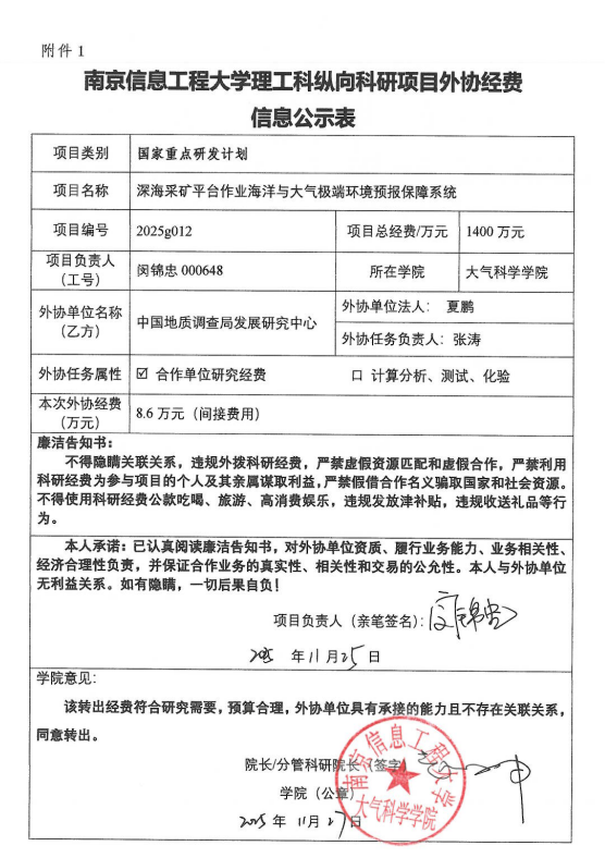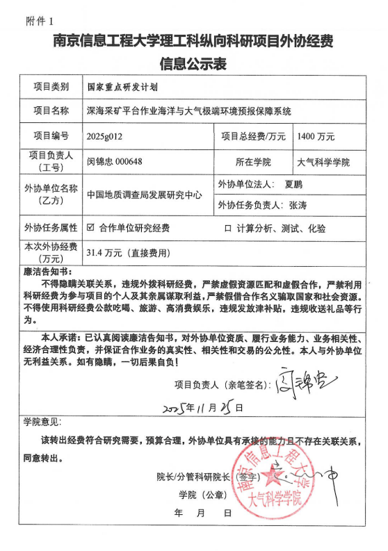 根据《中共教育部党组关于抓好赋予科研管理更大自主权有关文件贯彻落实工作的通知》(教党函〔2019〕37号)、《南京信息工程大学理工科纵向科研项目经费管理办法》(校发〔2025〕81号)、《南京信息17工程大学理工科纵向科研项目管理办法》(校发〔2024〕142号)相关规定,现对_大气科学学院闵锦忠负责人的_国家重点研发计划重点专项项目 的外协经费情况进行公示,公示时间为_2025年11月28日至2025年12月4日(公示时间不少于5个工作日)。若对本项目外协经费有异议,请于公示期内向学院或科学技术处反映并提交书面材料。反映公示对象的情况和问题要坚持实事求是的原则,以个人名义反映情况和问题要求签署或自报本人真实姓名,以单位名义反映情况的应加盖单位公章。